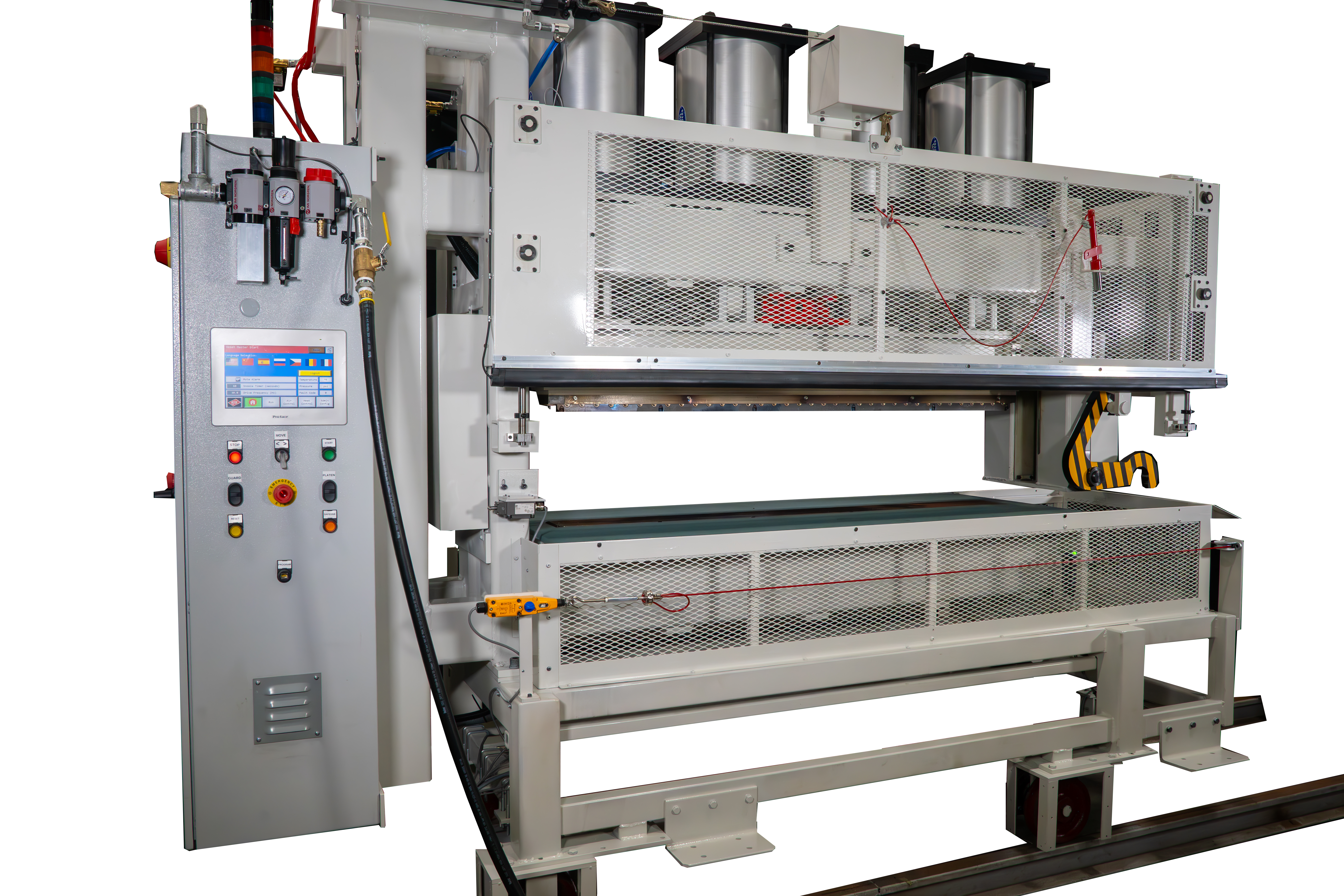 The Model 448 Splice Press is open on one end which allows the splice press to be moved onto or off centerline of the calender while the steel cords are in place. The press is mounted on tracks and motorized for ergonomic movement.